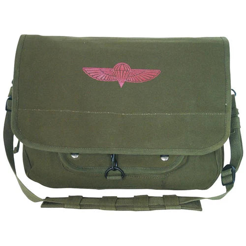 Our Israeli Paratrooper Bag is a vintage-styled replica of an Israeli Army shoulder bag. It features a main compartment under the storm flap with three organizer compartments, a front accessory pouch with a snap closure, nine pencil loops on the front accessory pocket, and an adjustable padded shoulder strap.