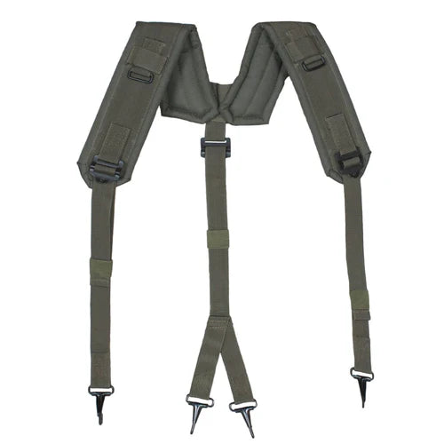 The LC-1 "Y" Suspenders were designed to support gear on pistol belts and can hold a water canteen, ammunition cases, or any other item a soldier in the field may require. These Y-shaped suspenders include three adjustable straps and four D-ring attachment points. It also has fully adjustable webbing via compression buckles and heavy-duty snap hooks.