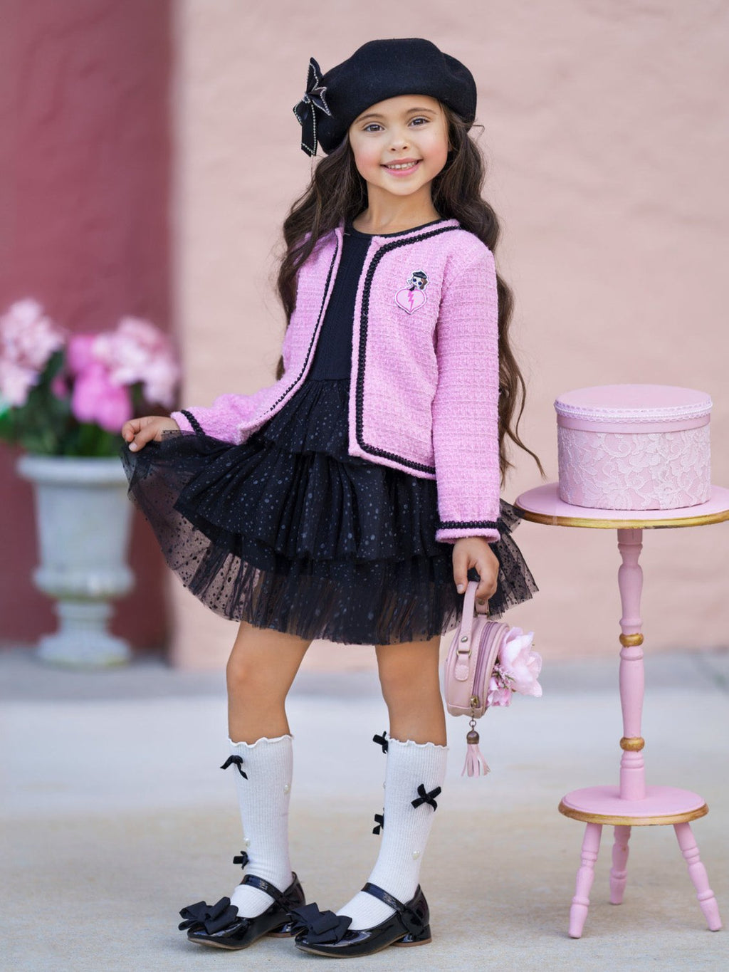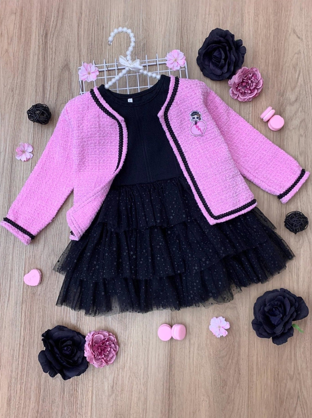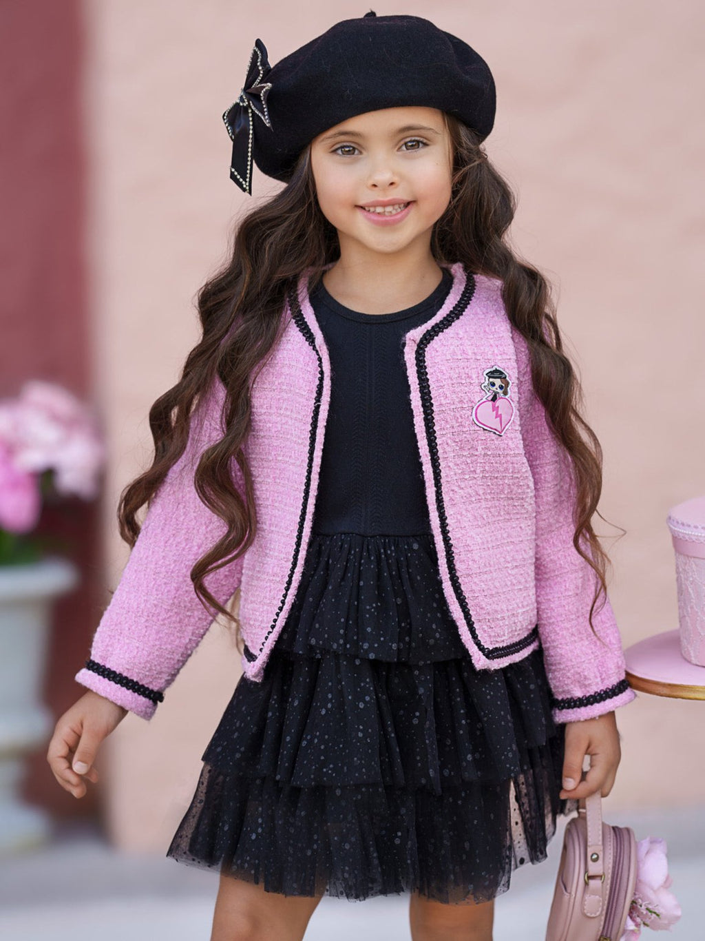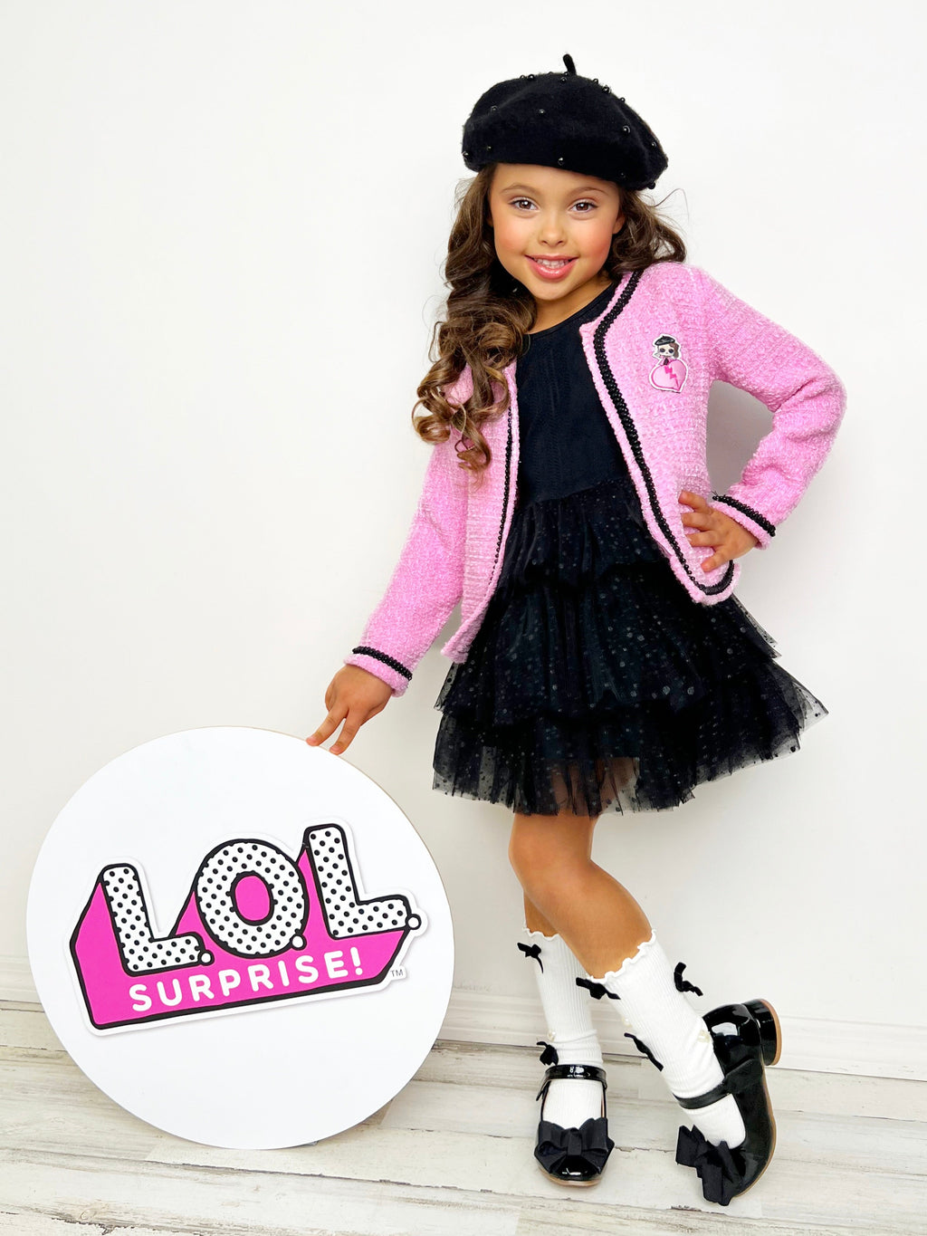 - Pink tweed blazer with embroidered L.O.L. SURPRISE!™ Posh character, and sleeveless black tutu dress with knit pattern body and layered polka dot glitter tulle skirt