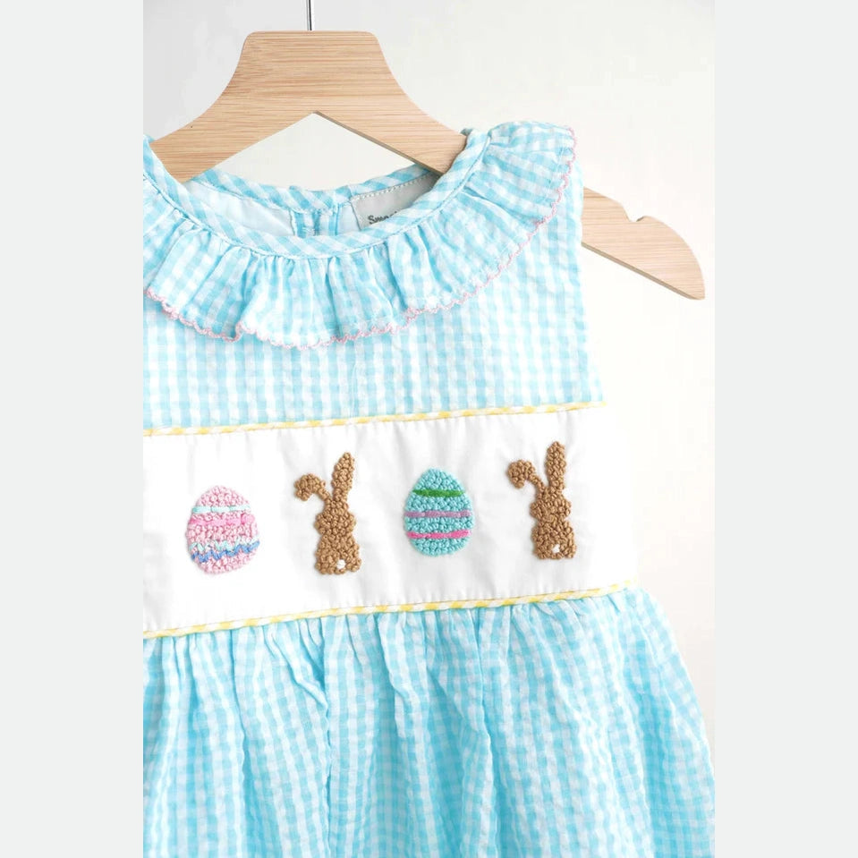 Blue Easter Bunny Egg French Knot Girl Gingham Seersucker Dress HS240929