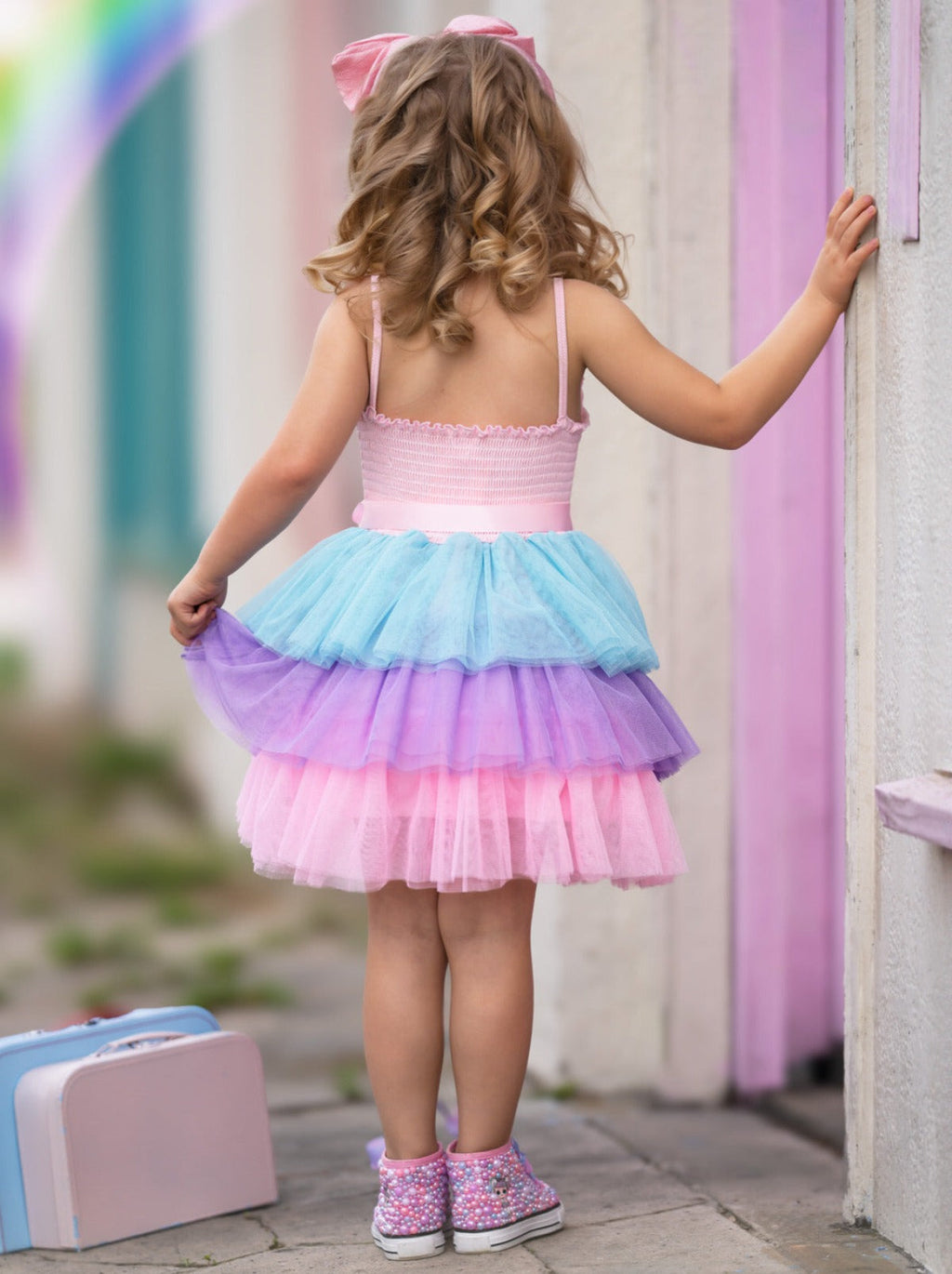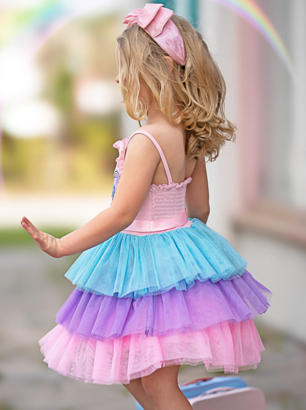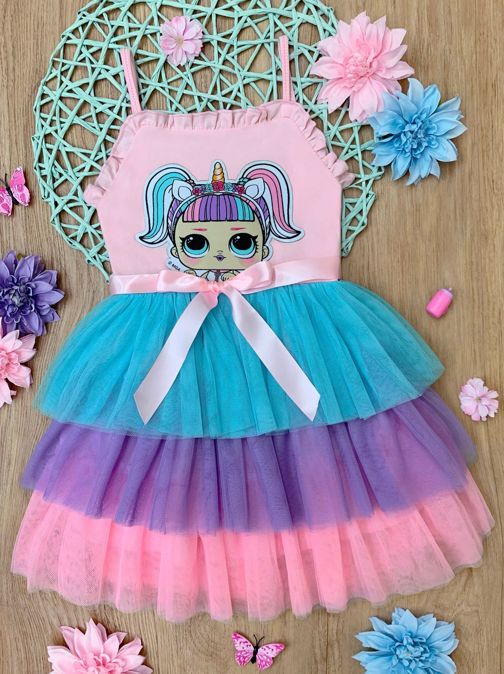 - Sleeveless tiered dress with frilled hem bodice, L.O.L. SURPRISE!™ Unicorn character embroidery, accent bow on waist, and tri-color pastel layered skirt.