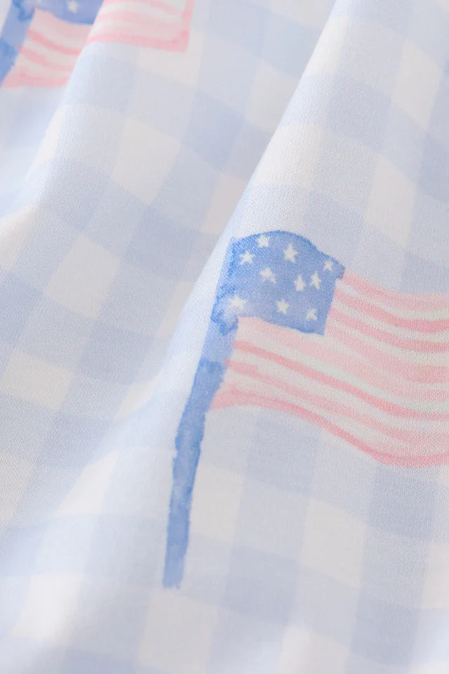 Make a statement in this blue flag embroidery smocked gingham dress! With its playful flag embroidery and flattering smocked design, this dress is perfect for any summer occasion. The blue gingham print adds a fun, quirky touch to your wardrobe. (Fits true to size, available in sizes XS to XL).