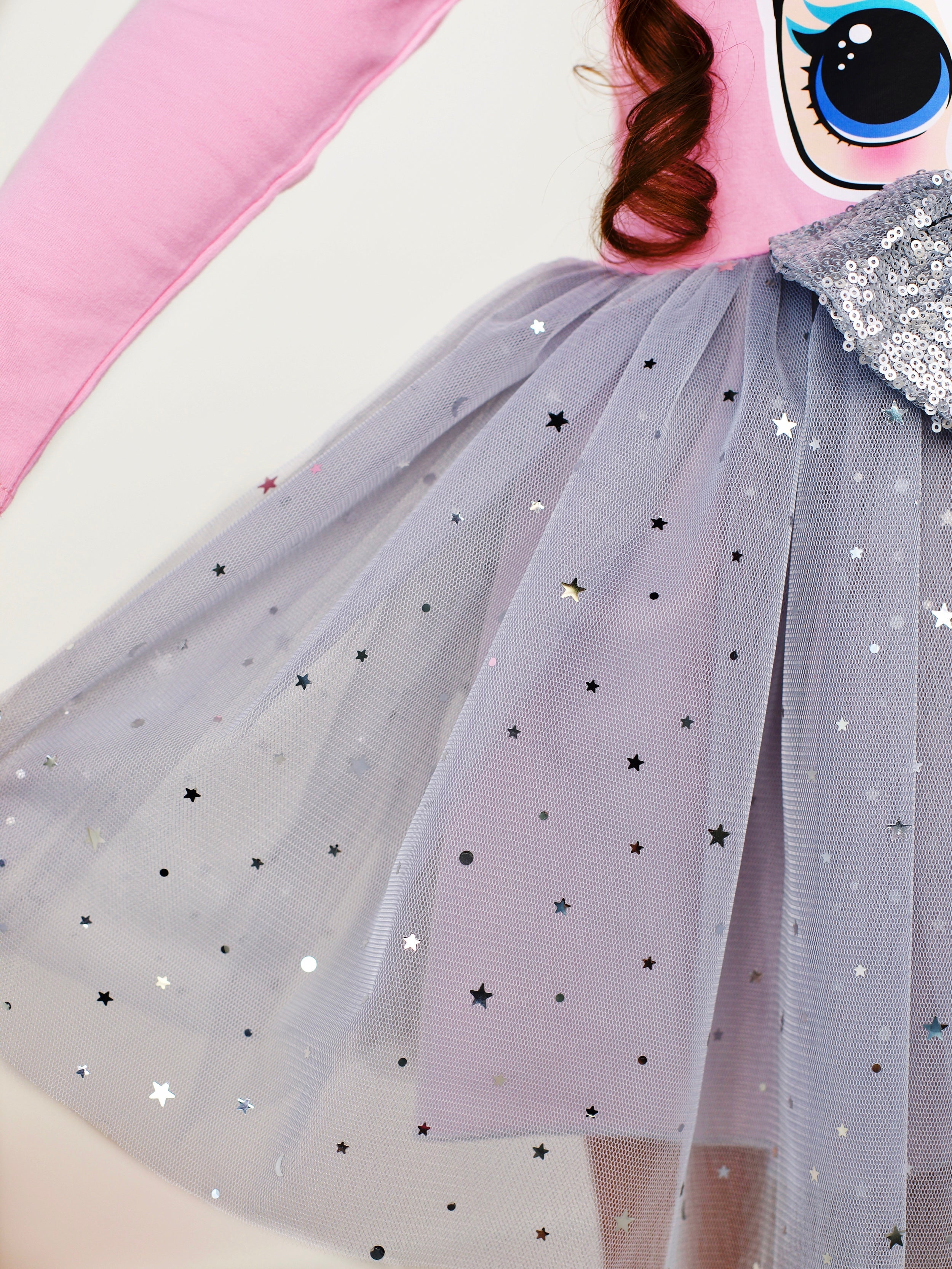 - Long sleeve tutu dress with embroidered L.O.L. SURPRISE!™ Kitty Queen character, tiered tulle skirt, and statement bow