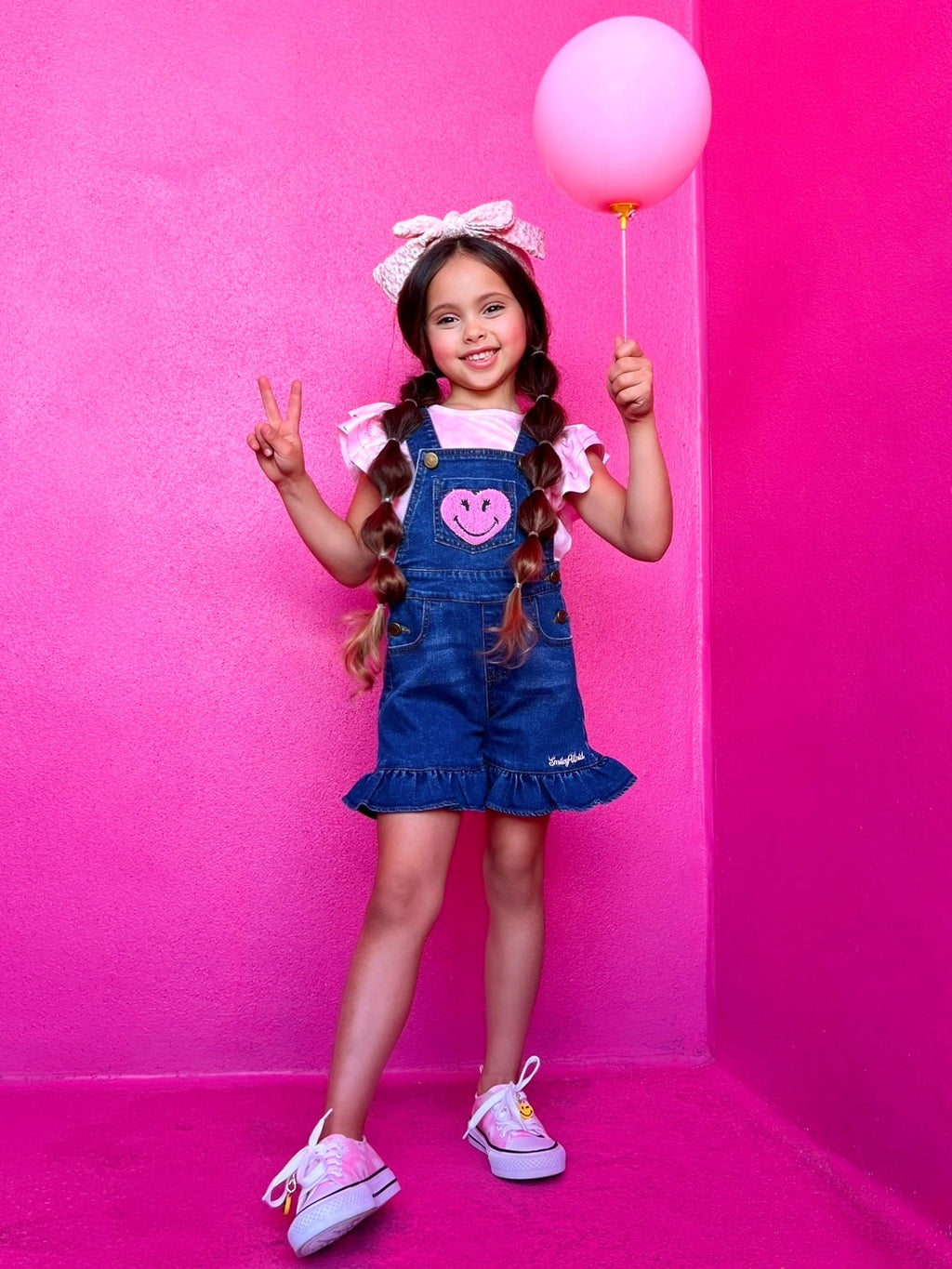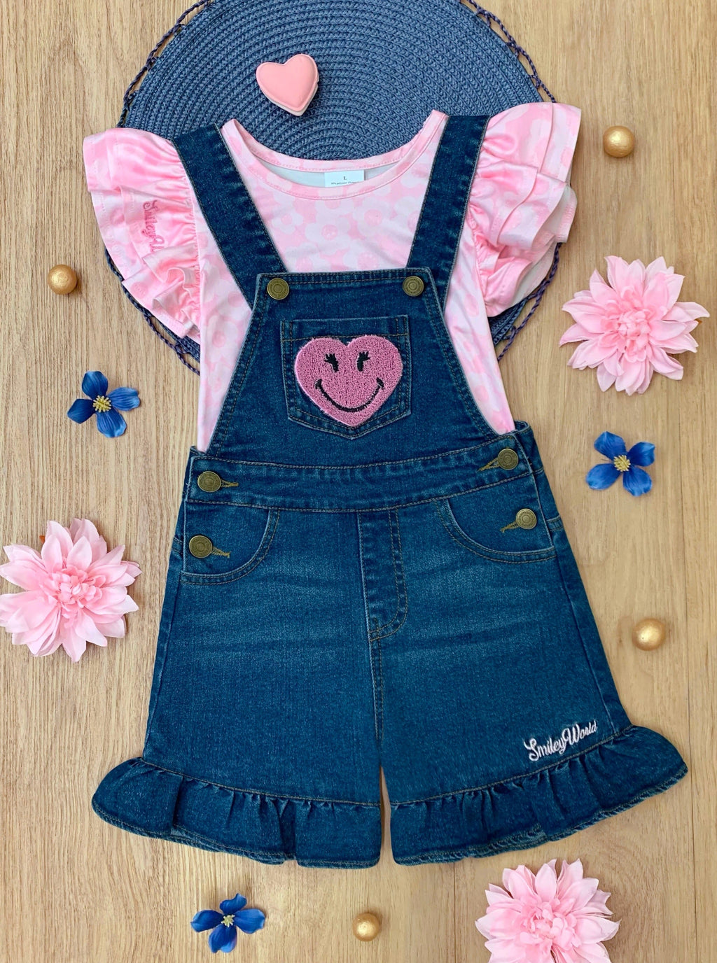 - Pink SmileyWorld® smiley face flower print top with flutter sleeves and denim overall shorts with ruffle trim, pink Smiley heart icon chenille embroidered patch pocket, front and back pockets, and SmileyWorld® embroidery