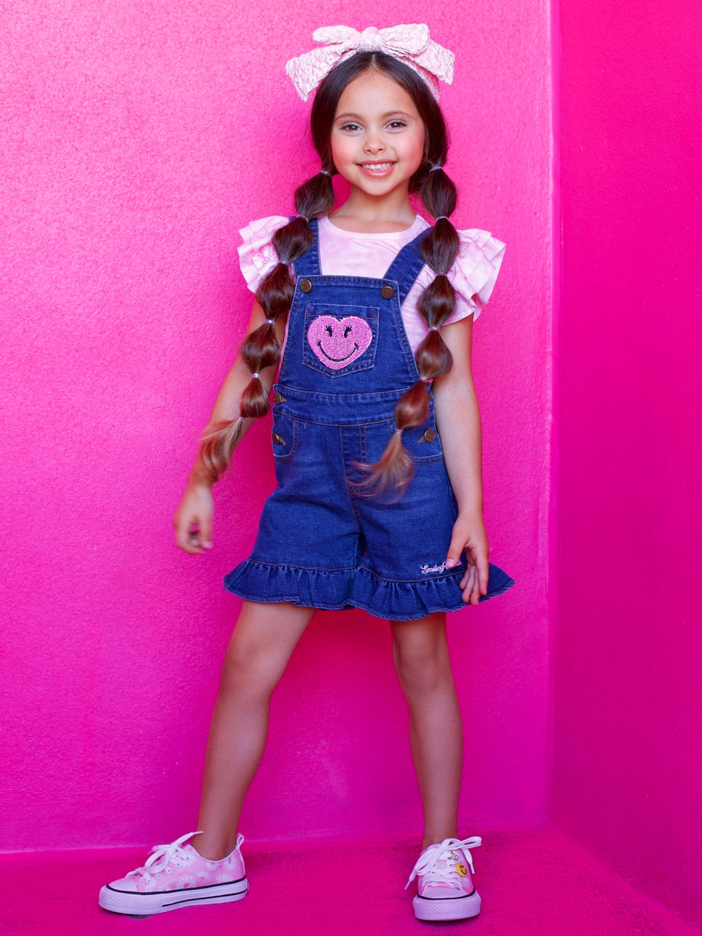 - Confidence starts with the right outfit. Get your little girl our amazing SmileyWorld® overall short set. Deep blue denim, girly ruffles, and a charming pink print top. It's fashion that speaks her language.
